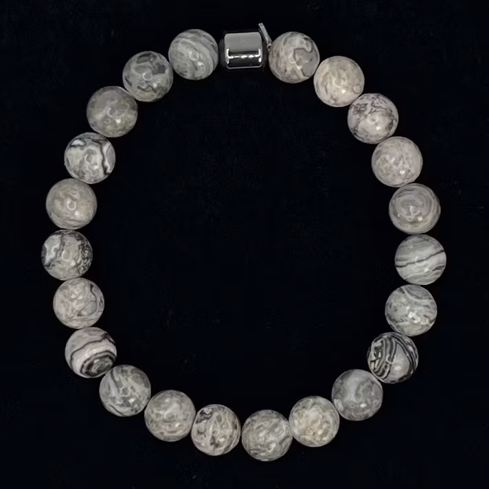 Misty Marble Armbåndet er laget av naturstein og glassperler i myke, lyse gråtoner. De subtile variasjonene i marmormønsteret gir armbåndet et delikat og harmonisk uttrykk – perfekt for deg som liker et tidløst og elegant tilbehør som passer til alle antrekk.