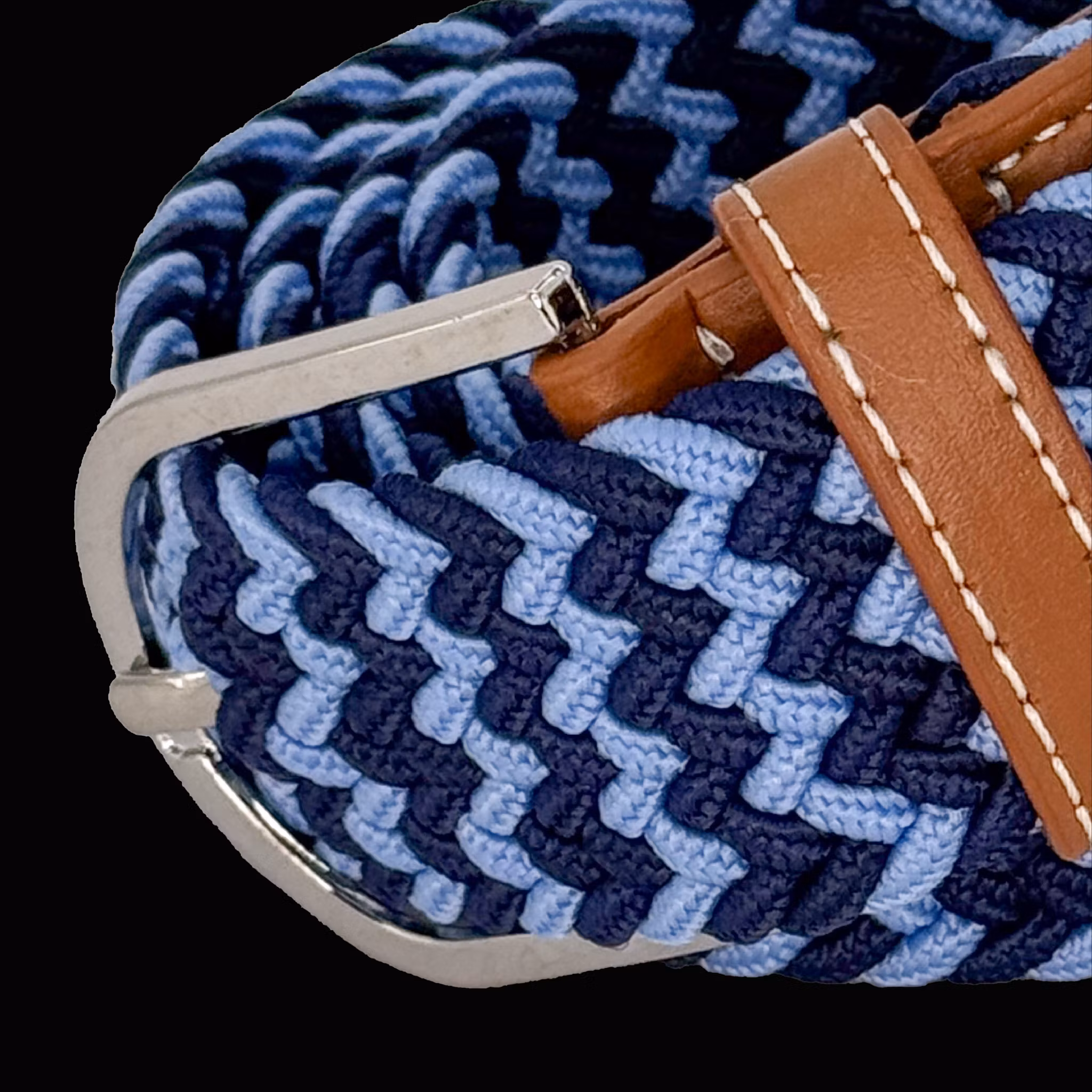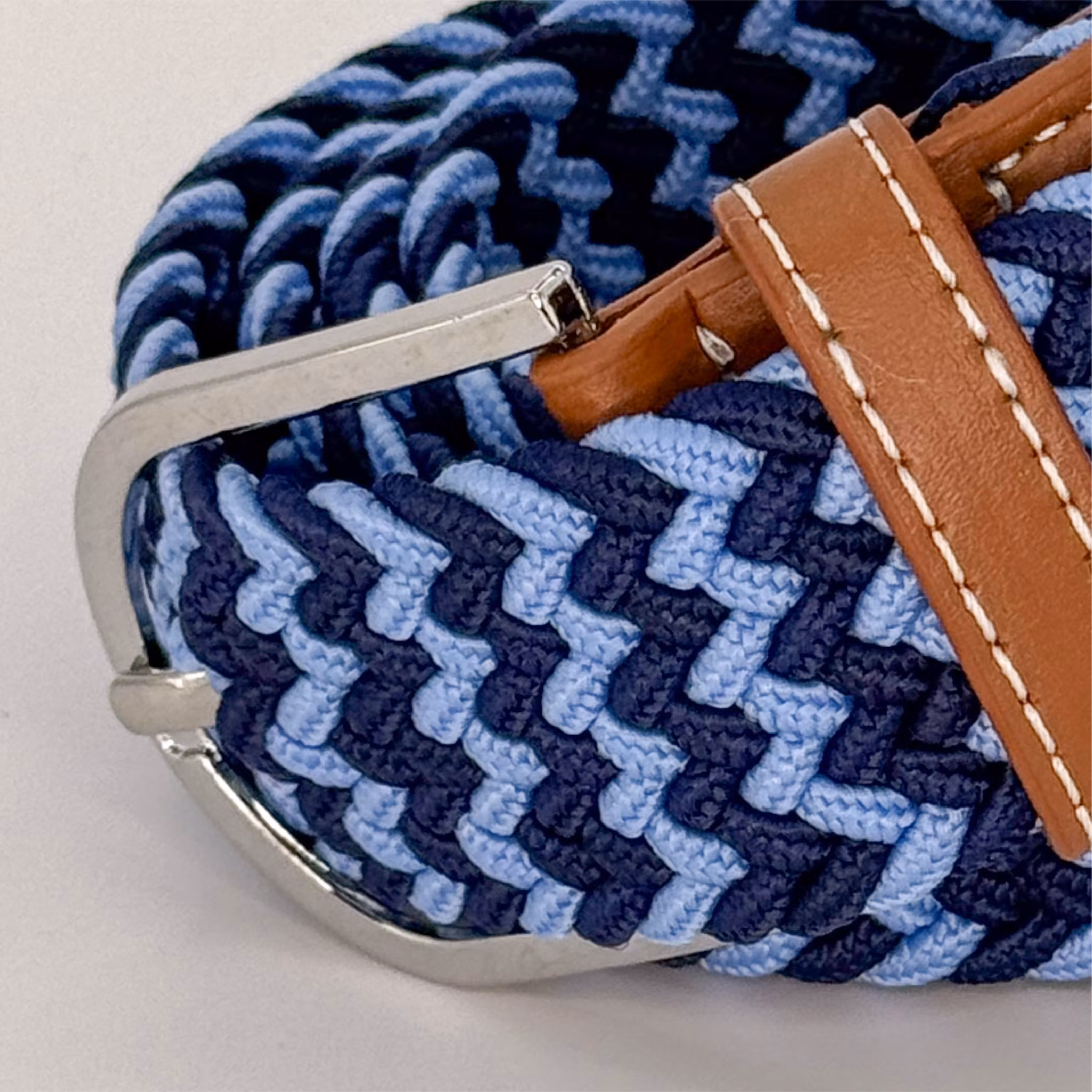 Et tidløst og komfortabelt belte i lys og mørk blå sebrastripe – inspirert av havstrømmer og bølger i bevegelse. Den elastiske kvaliteten gir perfekt passform som følger bevegelsene dine – ideelt til både hverdag, arbeid og fritid.