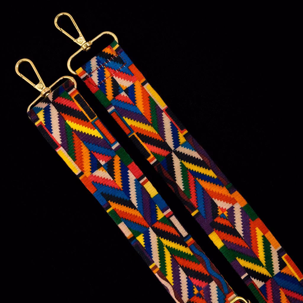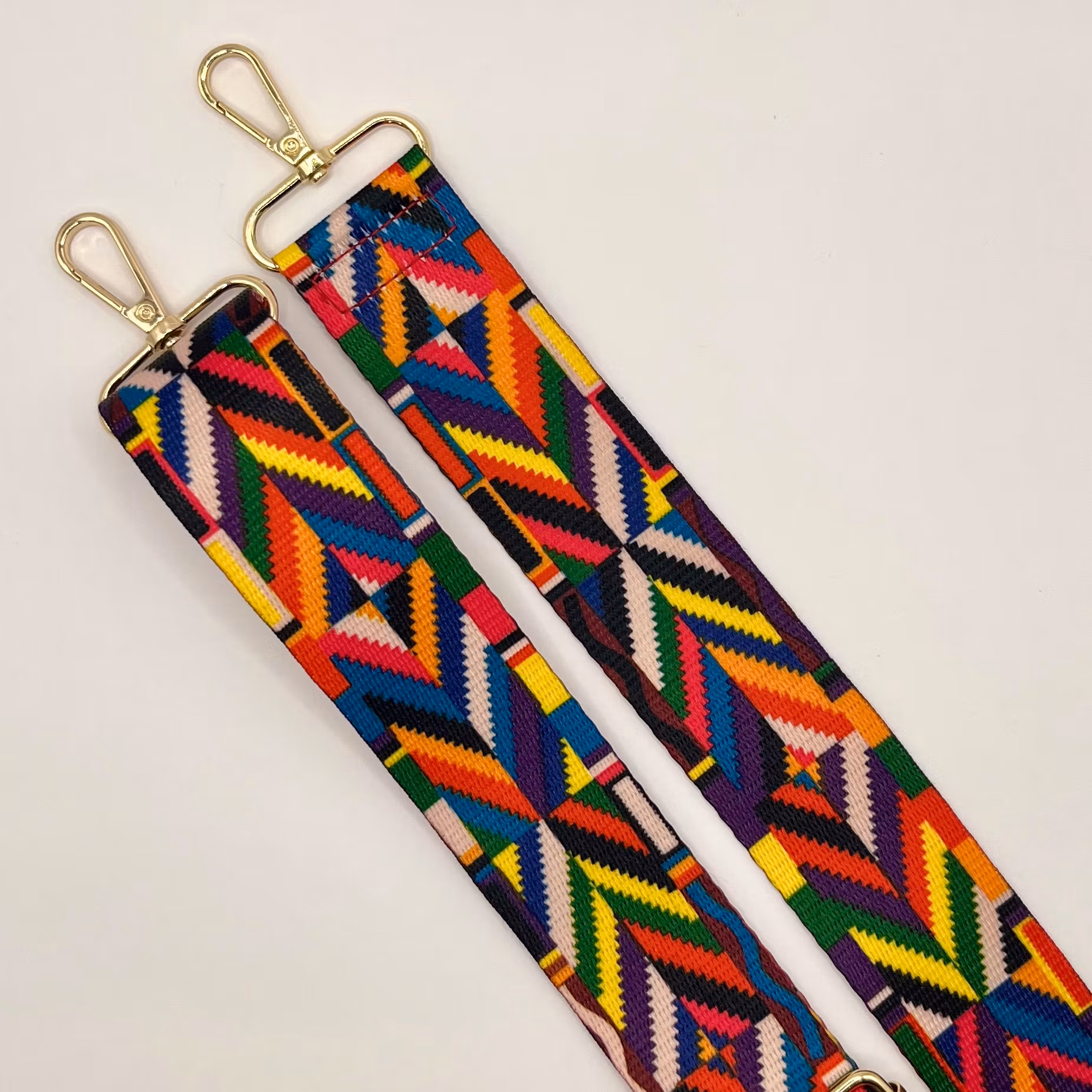 Et tidløst og dekorativt tilbehør med multifarget mønster i glade, livlige farger, med gullfargede metallfester.