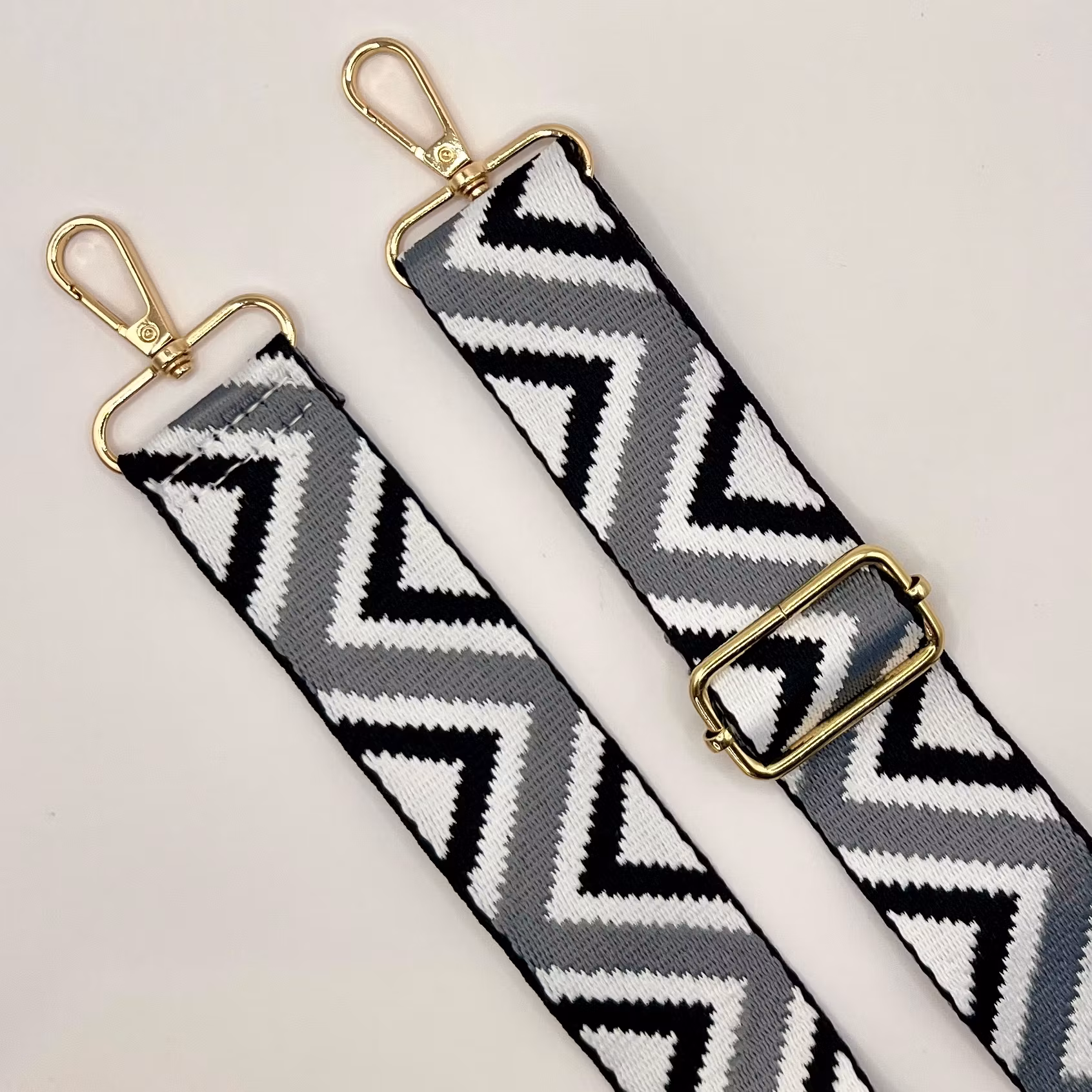 Et tidløst og dekorativt tilbehør med sort, hvitt og grått sikksakmønster.