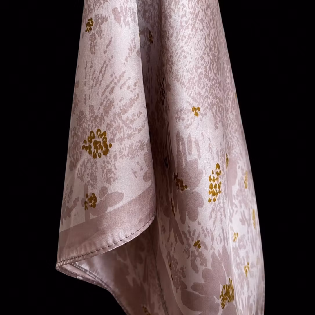 Et delikat og elegant pynteskjerf i en dus, lys rosatone som base, dekorert med et subtilt mønster i enda lysere nyanser. De vakre blomsterdetaljene i myke brun- og gråtoner tilfører et naturlig og harmonisk uttrykk.