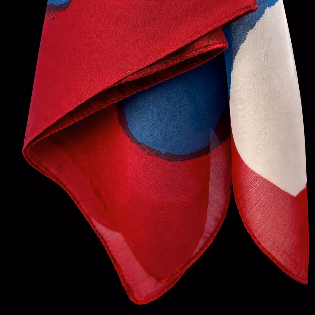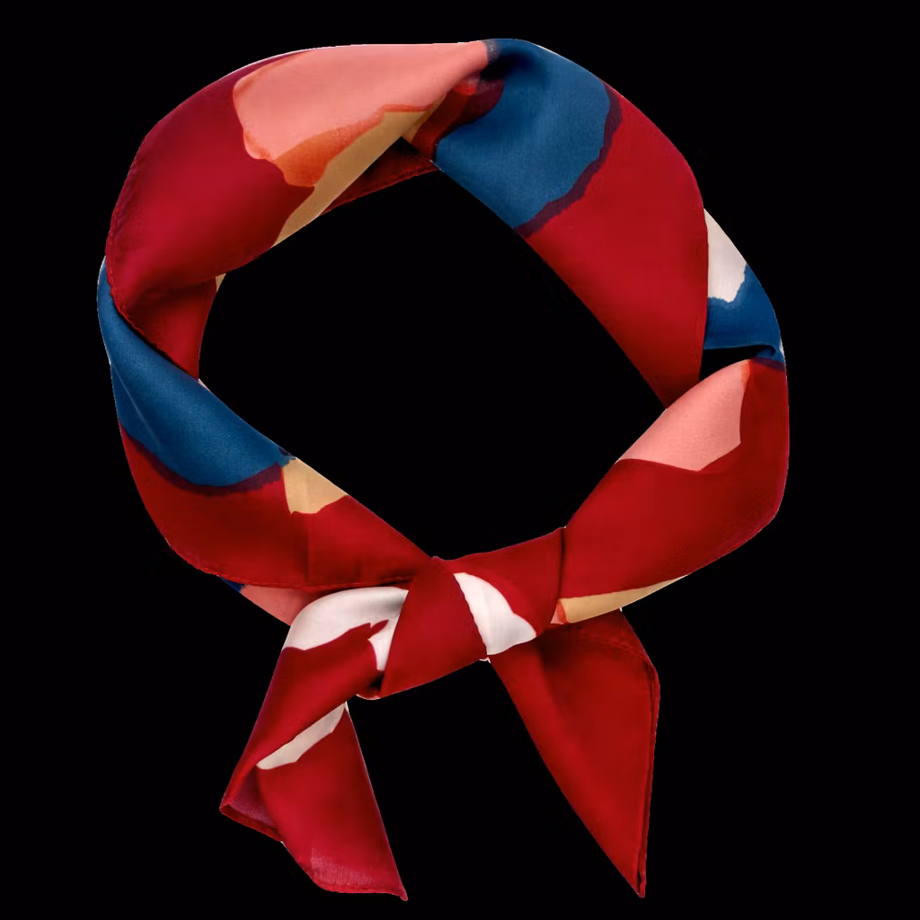 Et moderne og uttrykksfullt pynteskjerf med mørkerød bunnfarge og runde, grafiske former i sennepsgult, krem og blått. Crimson Orbit kombinerer varme, dypt mettede toner med lekne, myke geometriske elementer som tilfører antrekket både energi og eleganse. Kontrasten mellom de levende fargene og den rike røde bakgrunnen skaper et stilrent, men iøynefallende preg. Perfekt å bruke rundt halsen, i håret, på vesken eller som et dekorativt belte – et allsidig tilbehør som gir looken et kunstnerisk og moderne uttrykk.