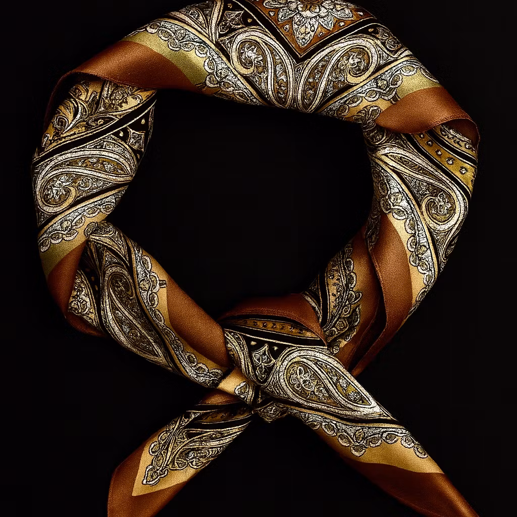 Et tidløst og sofistikert pynteskjerf med paisleymønster i varme brune og naturlige grønntoner. Earth Paisley kombinerer klassiske paisleyformer med rolige, jordnære farger, og gir antrekket et elegant og balansert preg. Mønsterets intrikate detaljer tilfører dybde og struktur, og gjør skjerfet perfekt rundt halsen, i håret, på vesken eller som et dekorativt belte – et allsidig tilbehør som løfter looken med subtil stil og karakter.
