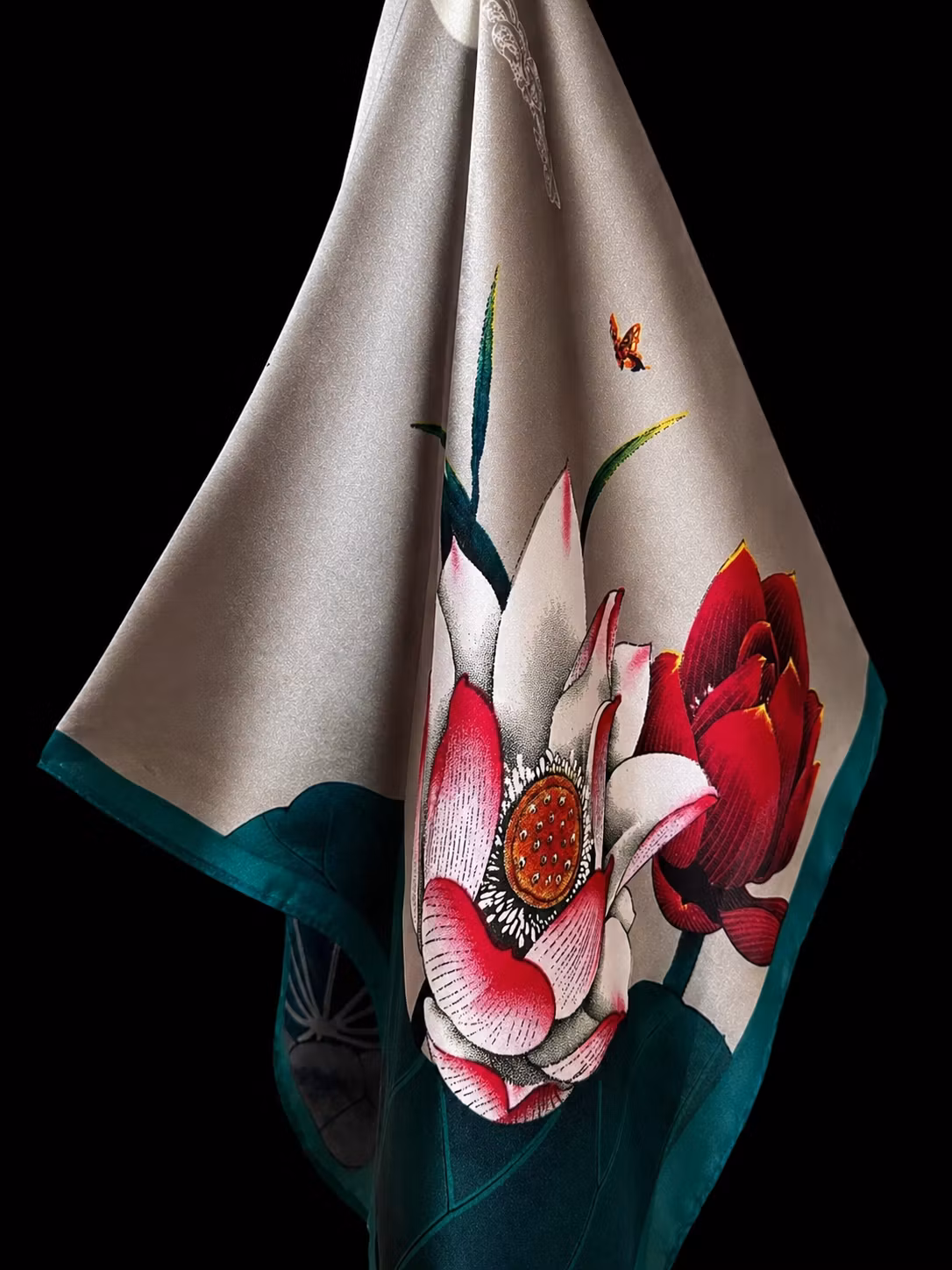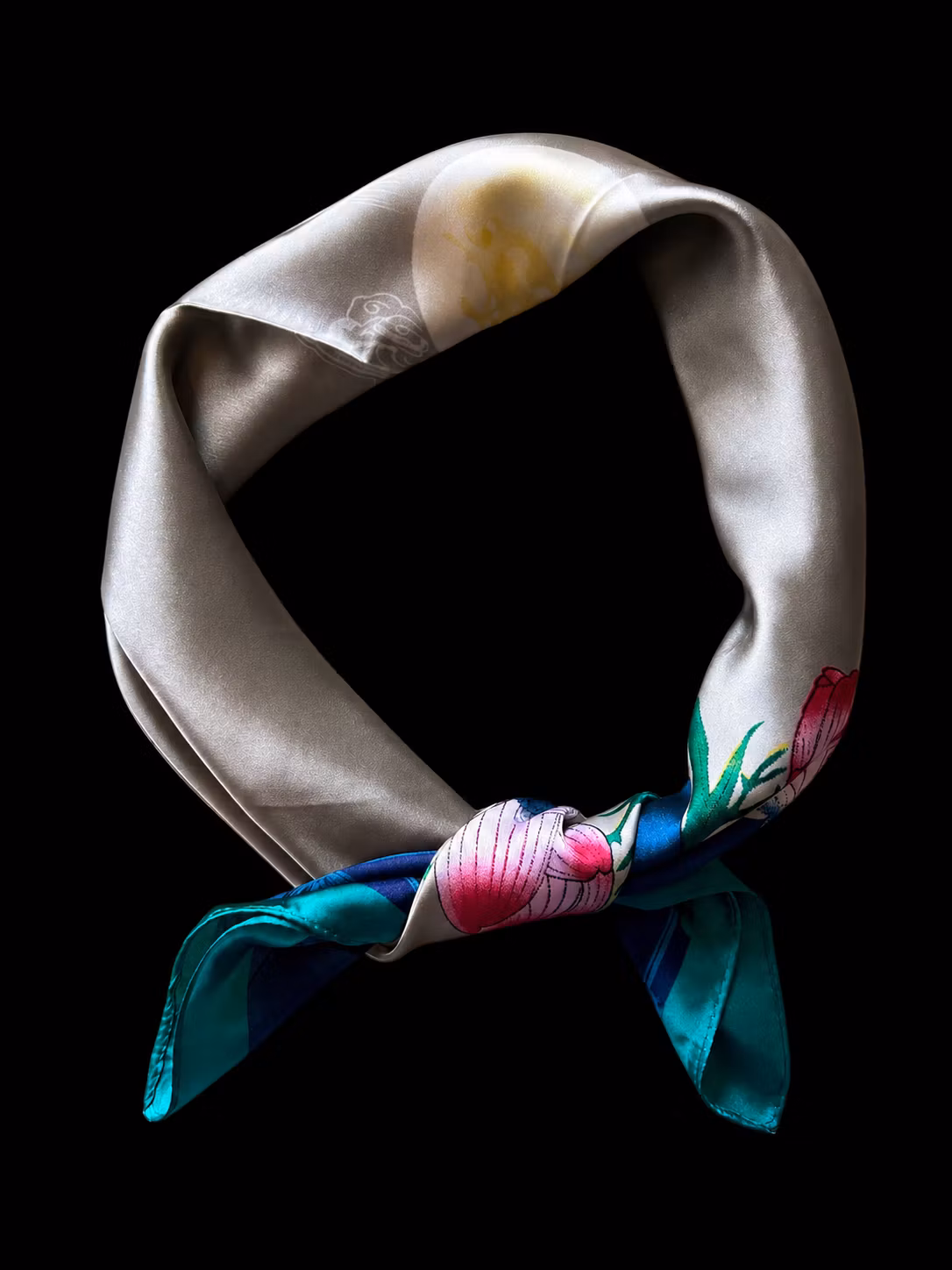 Et sofistikert og delikat pynteskjerf med en dempet grå bunnfarge, rammet inn av en dyp grønn kant som gir et elegant og definert uttrykk. Emerald Bloom Veil kombinerer et rolig og tidløst fargegrunnlag med et livlig blomsterdesign i hvite og røde nyanser, som skaper en harmonisk balanse mellom det klassiske og det dekorative. De subtile kontrastene fremhever mønsteret uten å virke overveldende, og gir skjerfet et raffinert, men friskt preg.
