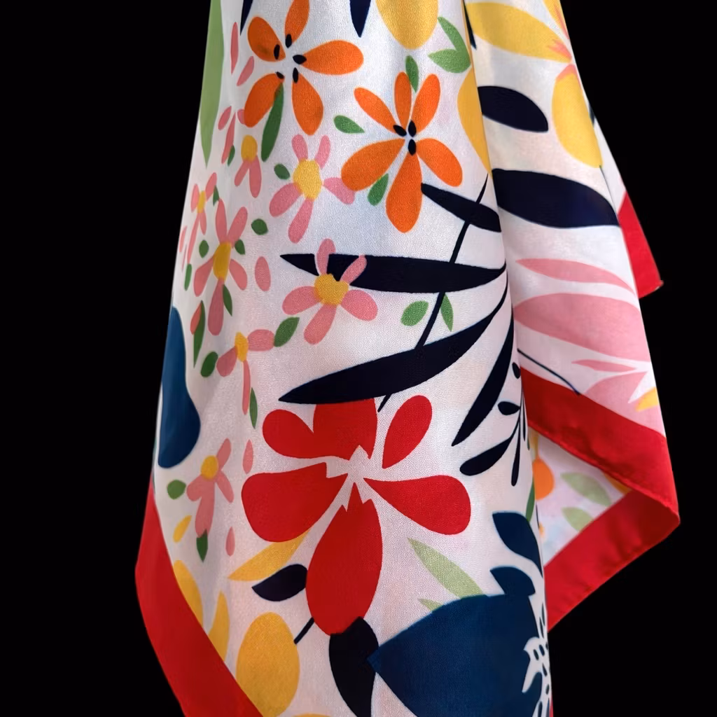 Et friskt og livlig pynteskjerf med hvit bunnfarge dekorert med blomster i klare og energiske nyanser av rosa, gul, grønn, sort, rød og oransje. Floral Breeze kombinerer en ren og lys base med et lekent blomsterdesign som gir antrekket et fargerikt og sommerlig uttrykk. De sterke fargene skaper en vakker kontrast mot den hvite bakgrunnen og fremhever mønsterets detaljer på en elegant måte.