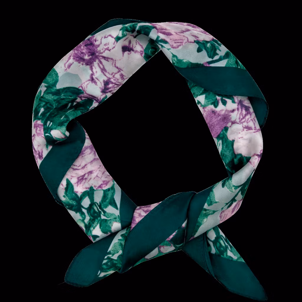 Et friskt og delikat pynteskjerf med grønt mønster og lilla blomster på en ren hvit bakgrunn. Lavender Meadow kombinerer naturinspirerte farger med et lett og luftig uttrykk, som gir antrekket et mykt, tidløst preg. De lilla blomstene og de grønne detaljene skaper en harmonisk kontrast som tilfører dybde og eleganse. Perfekt å style rundt halsen, i håret, på vesken eller som et dekorativt belte – et allsidig tilbehør som gir looken en subtil, men frisk og feminin signatur.