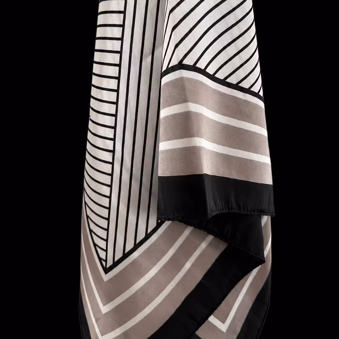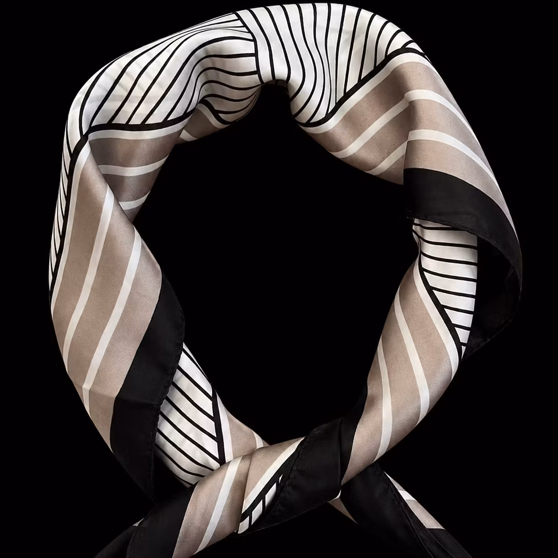 Et stilrent pynteskjerf med klassiske sorte og hvite striper som base, elegant innrammet av en myk kant i beige og lys brun. Kontrasten mellom de rene stripene og de varme kanttonene gir skjerfet et balansert og sofistikert uttrykk.