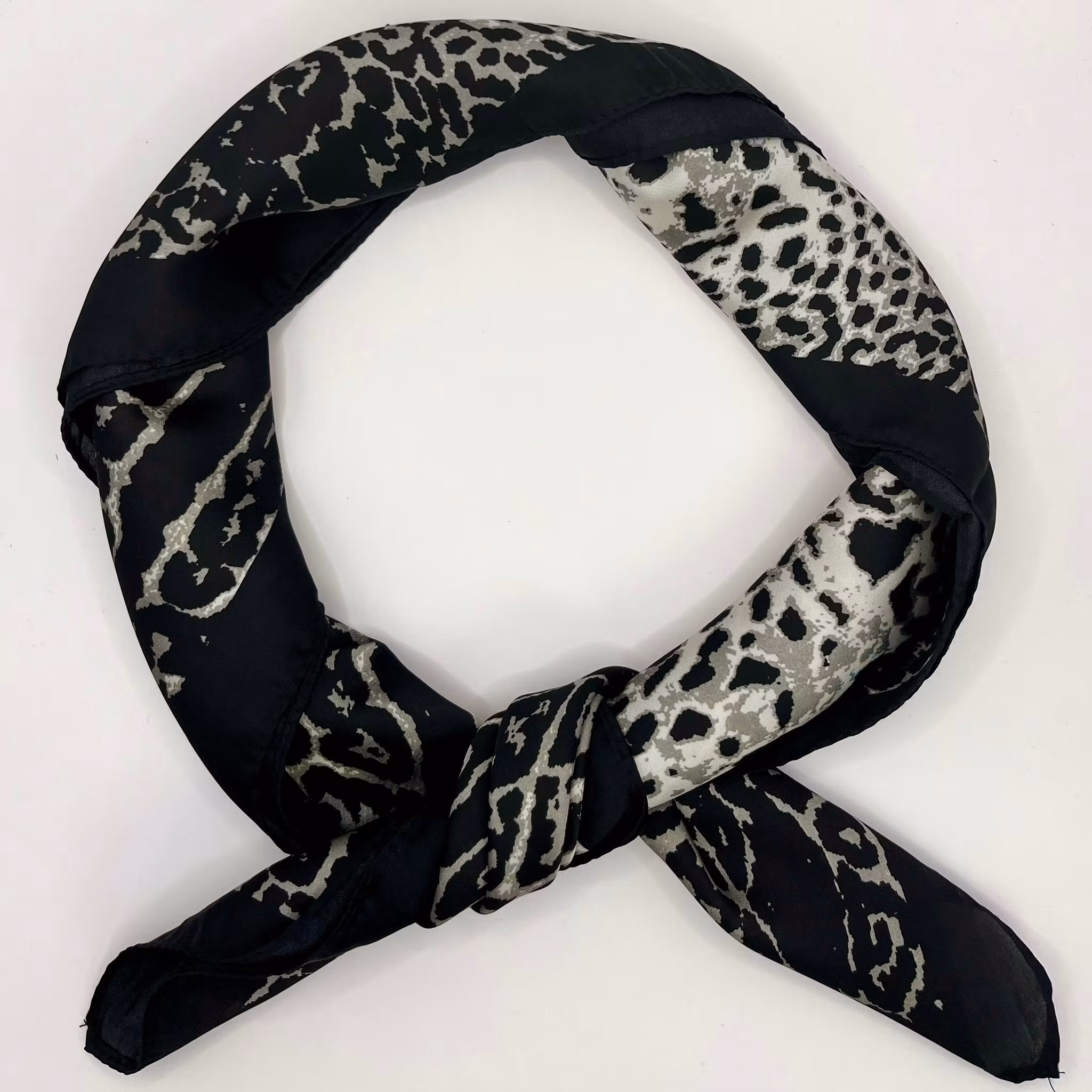 Et sofistikert og tidløst skjerf med et elegant leopardmønster i nøytrale steintoner. Designet kombinerer klassisk dyreprint med en rolig og moderne palett, og tilfører antrekket både stil og karakter. Stone Leopard kan brukes rundt halsen, i håret, på vesken eller som et subtilt belte – et allsidig tilbehør som løfter ethvert look med enkel eleganse.