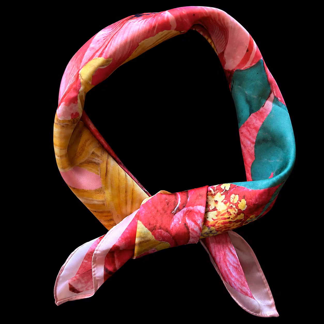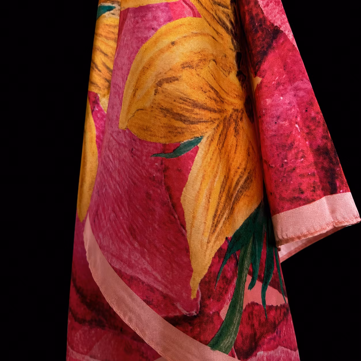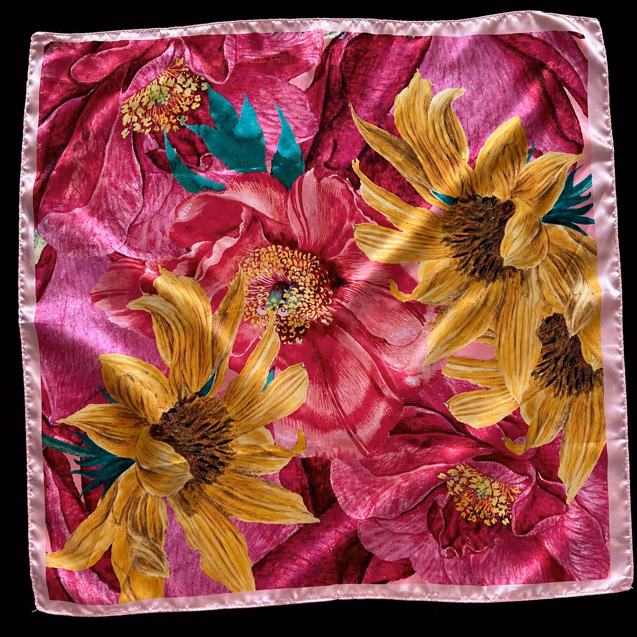 De harmoniske fargene gir skjerfet et lett og sommerlig preg, samtidig som det beholder en elegant og sofistikert stil. Solsikkemotivet tilfører et naturlig og optimistisk uttrykk, mens rosatonene gir mykhet og balanse.