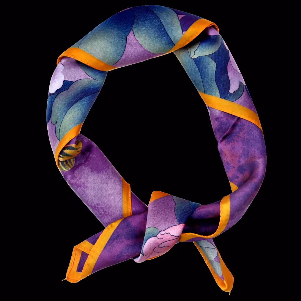 Et livfullt og energisk pynteskjerf med blomster i sterke lilla, gule og blå nyanser. Vibrant Bloom kombinerer klare, lekne farger med et iøynefallende mønster som gir antrekket både liv og karakter. De sterke kontrastene fremhever blomstenes former og skaper et uttrykk som er både moderne og tidløst. Perfekt rundt halsen, i håret, på vesken eller som et dekorativt belte – et allsidig tilbehør som tilfører looken både farge og glede.