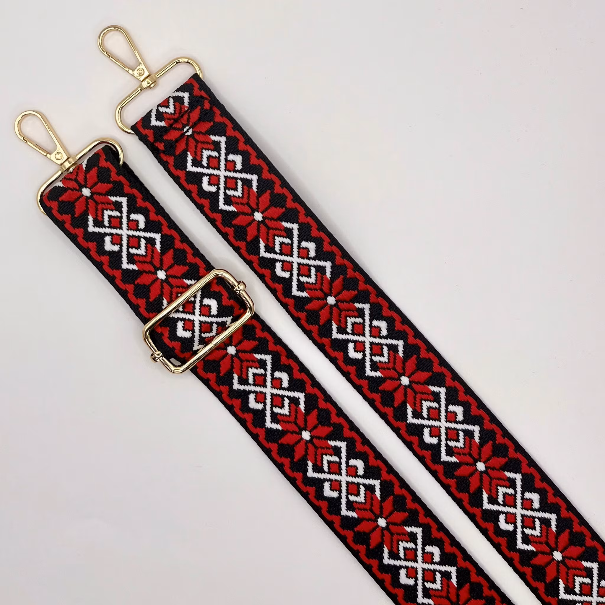 Et dekorativt og tidløst tilbehør med røde blomster inspirert av bunadstil, kombinert med sort og hvitt. Den lekne og elegante designen gir vesken et personlig og sofistikert preg, og er perfekt for å oppgradere enhver veske med stil.