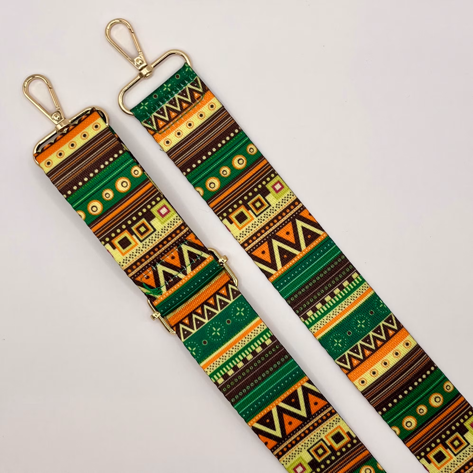 Et tidløst og dekorativt tilbehør med mønster i grønne, brune og oransje toner.