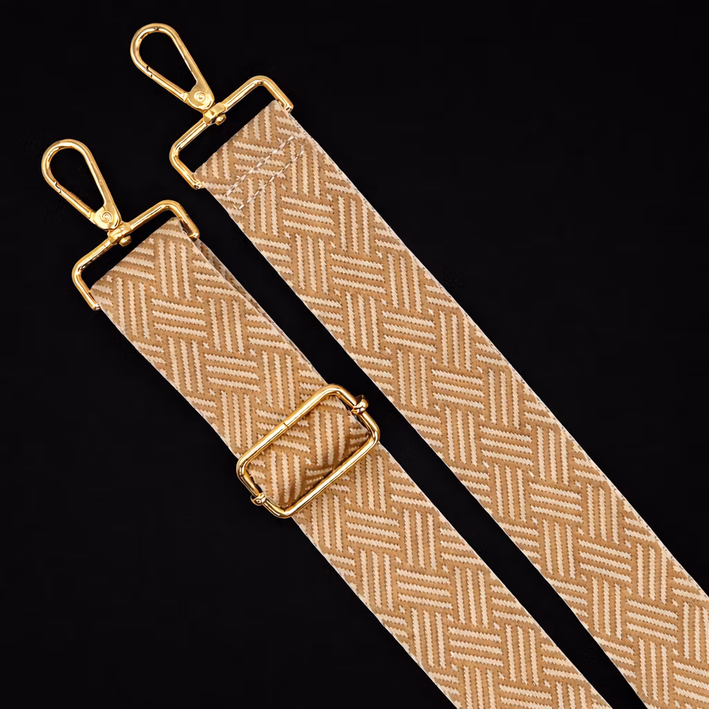 Et elegant og dekorativt tilbehør med et grafisk zigzag-mønster i varme karamell- og kremtoner, kombinert med stilige gullfargede metallfester. Den moderne, lekne designen gir vesken et personlig og sofistikert preg, og er enkel å bruke for å oppgradere enhver veske med stil.