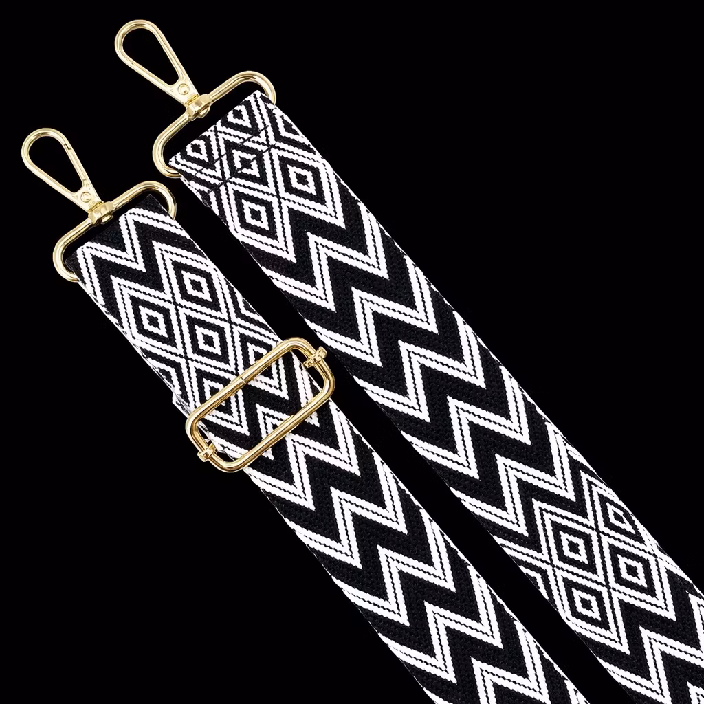 Et tidløst og dekorativt tilbehør med et grafisk mønster i sort og hvitt, kombinert med stilige gullfargede metallfester. Den moderne stripete og rutete designen tilfører vesken et personlig og sofistikert preg, samtidig som den er enkel å style og oppgradere enhver veske med.